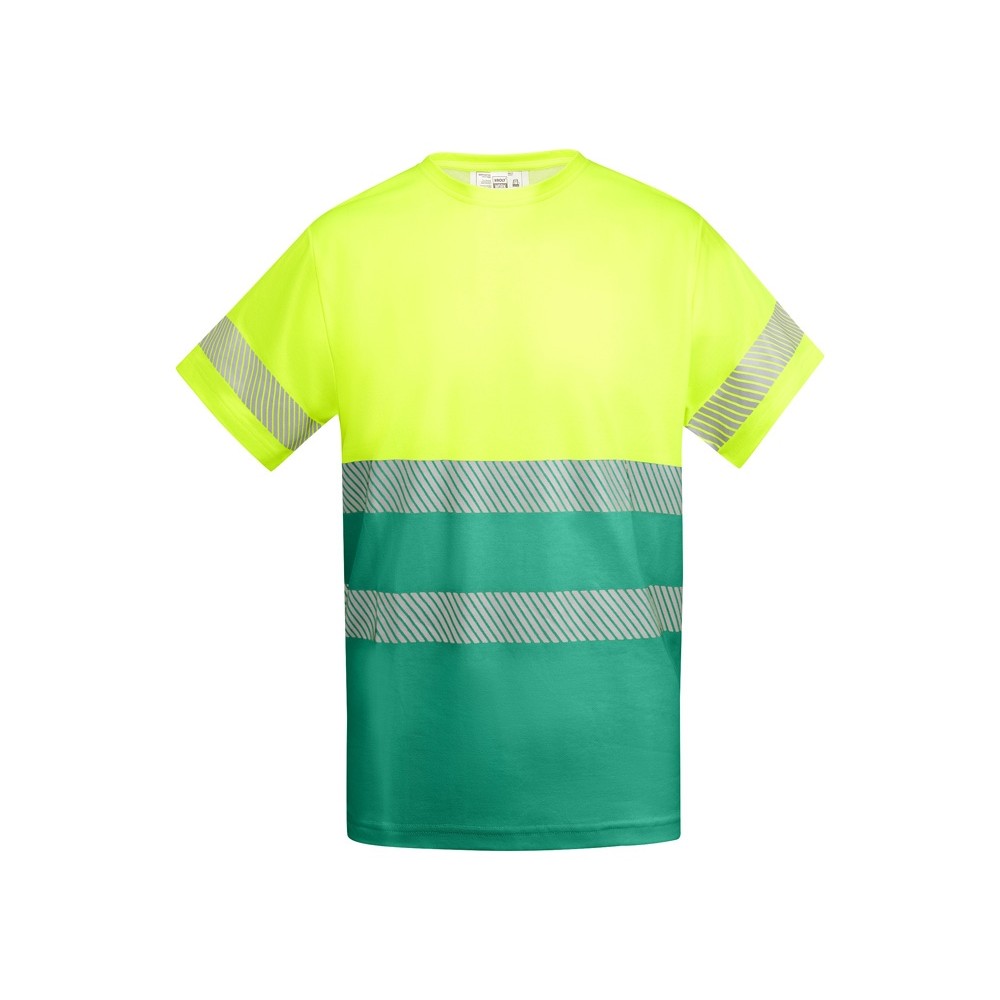 Мужская футболка с коротким рукавом с круглым вырезом под горло из основной ткани. Две светоотражающие сегментированные полосы на груди и одна на рукавах. Микс полиэстера и хлопка для повышенной воздухопроницаемости.