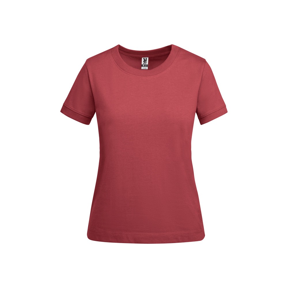 Женская футболка с коротким рукавом из плотного хлопка. Широкая горловина в рубчик 2x1 и окантовка краев рукавов. Усиленные закрытые швы по горловине. Боковые швы. Наличие логотипа Roly на левой стороне низа и широкая отстрочка.