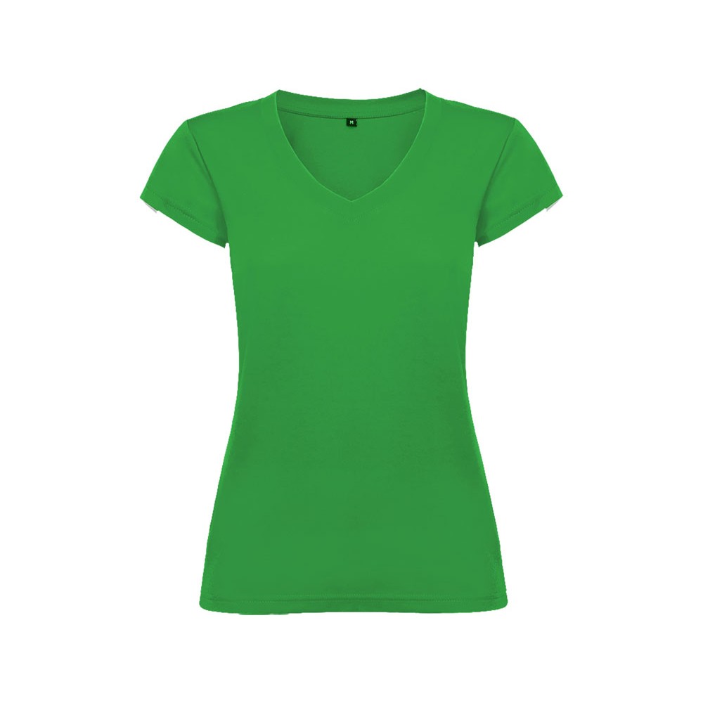 Женская футболка с коротким рукавом и V-образной горловине, обработано рибом 1х1. Полуприлегающий силуэт модели с боковыми швами.