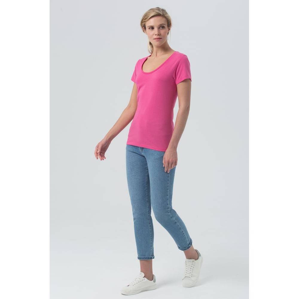 Женственная футболка с глубоким круглым вырезом.