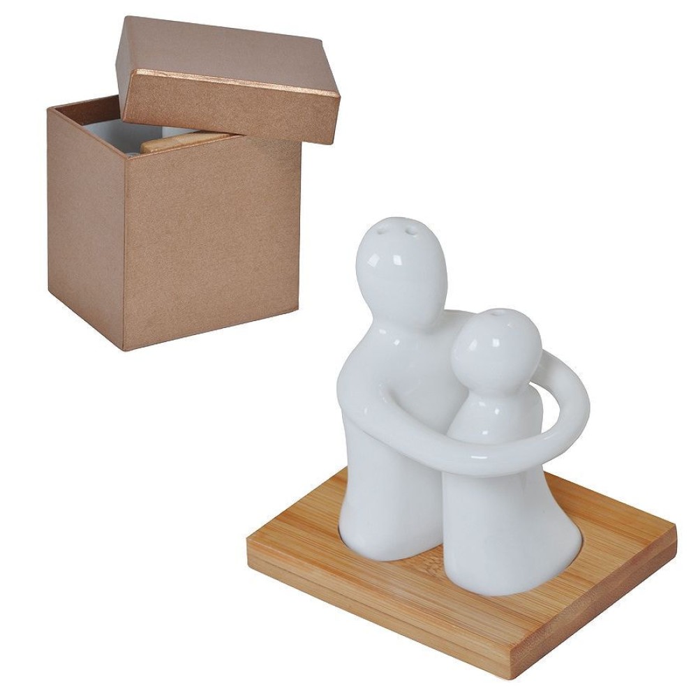 Солонка и перечница "Объятия" в упаковке, 9х8х9,5см, фарфор, бамбук