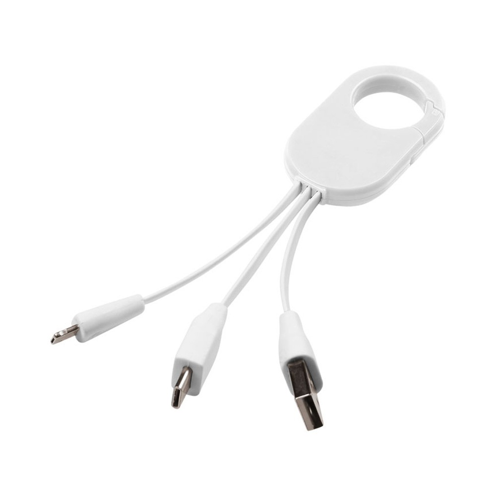 Кабель для зарядки 3-в-1. Кабель для зарядки Troop 3-в-1 с коннектором USB Type C и двойным совместимым коннектором 2-в-1 для устройств Apple® iOS и Android. Кабель оснащен карабином для удобного крепления к сумке. АБС-пластик.