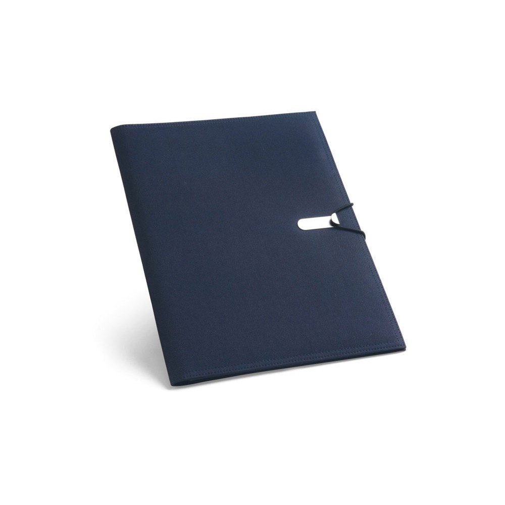 Папка A4 из 600D с застежкой на резинке. Папка имеет блокнот из 20 листов в линейку, 3 внутренних кармана и держатель для шариковой ручки (ручка не входит в комплект). 240 x 325 x 15 мм. Вид нанесения, рекомендуемый поставщиком: гравировка, трансфер.