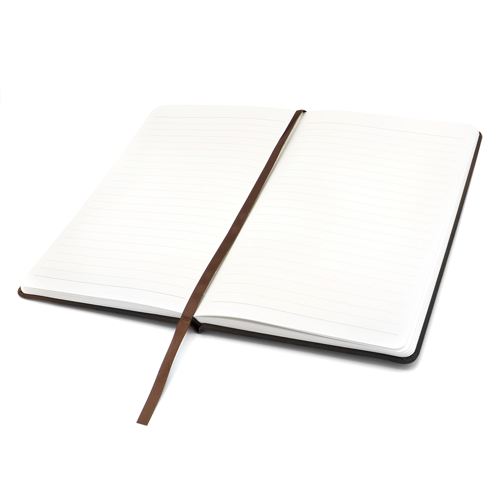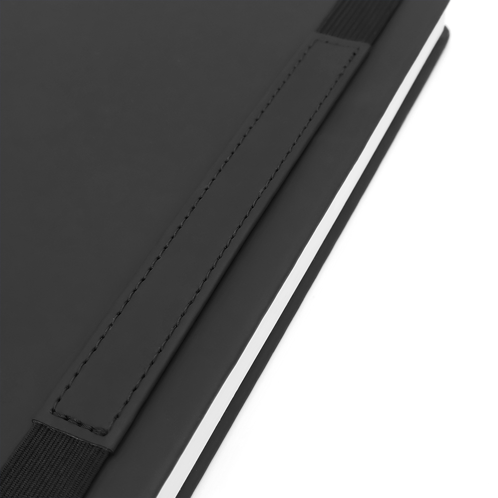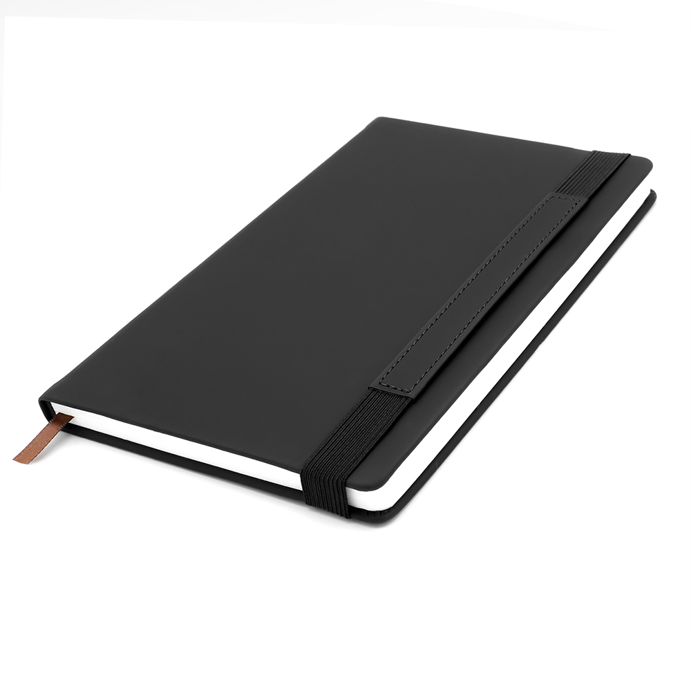 Блокнот формата А5 в твёрдой обложке из искусственной кожи. Материал обложки — термополиуретан, текстура — гладкая. Из особенностей: широкая эластичная застёжка со вставкой из кожзама. На неё можно нанести логотип либо слоган вашей компании. Размеры: 214*138*17 мм, 192 страницы / 96 листов, страницы разлинееные, бумага плотностью 80 г/м2. Размер вставки из кожзама 134*17 мм; ширина застёжки — 15 мм.