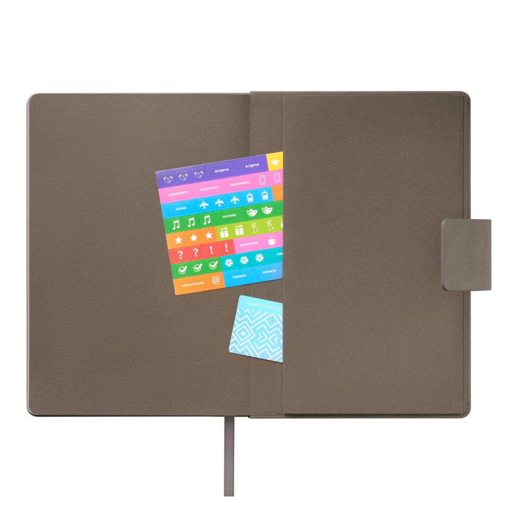 Оригинальный квадратный магнитный клапан надежно фиксирует обложку. Внутри — кремовые страницы из гладкого шелковистого офсета со скругленными уголками, форзац и нахзац, а также срез в тон обложки, создают гармоничное сочетание. Элегантное атласное ляссе дополняет изысканный образ.