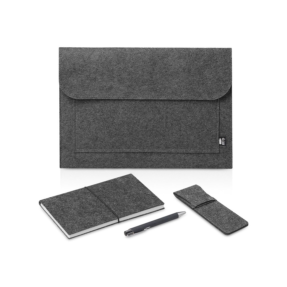 Стильный и функциональный набор для тех, кто ценит простоту и экологичность. В комплект входят: • Блокнот A5 в мягкой обложке из переработанного фетра, • Шариковая кнопочная ручка в бумажном корпусе с пластиковыми деталями, • Пенал для ручки из переработанного фетра, • Вместительный чехол для ноутбуков/планшетов до 14 из переработанного фетра, который служит упаковкой набора. Идеально подходит для офиса, учебы и путешествий. Лаконичный дизайн и натуральные материалы создают ощущение уюта и продуманности в каждой детали.