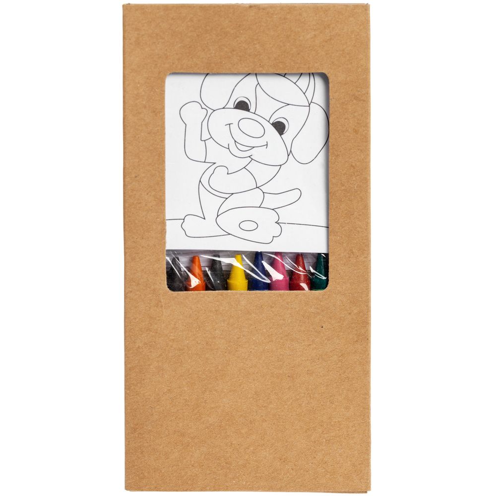 В набор входят 8 картинок для раскрашивания и 8 цветных восковых мелков.