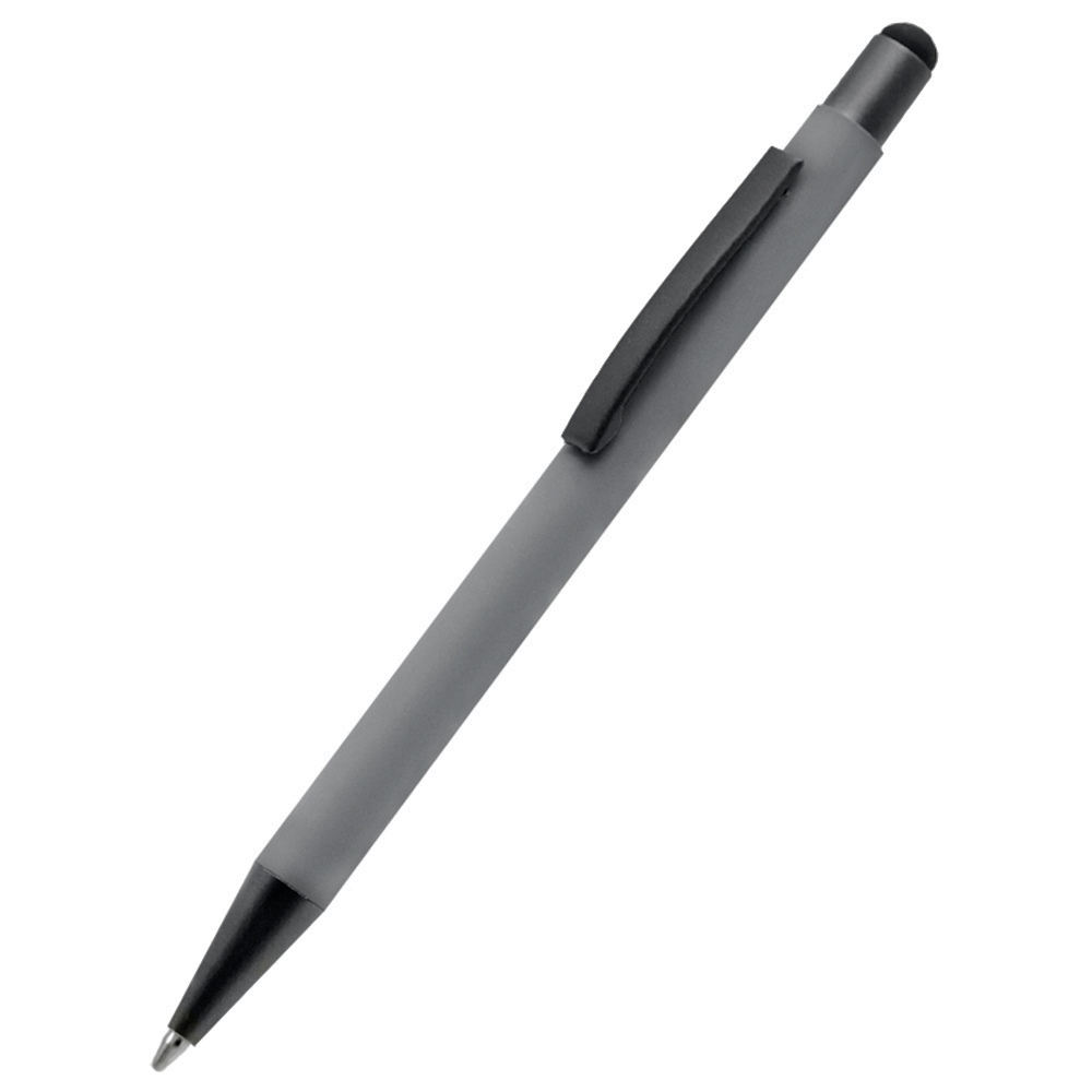 Бархатистая на ощупь ручка Story сотф-тач сделана из металла. Синие чернила, имеет стилус для взаимодействия с портативными устройствами. Толщина пишущего узла 1 мм, длина письма рассчитана на 700 м. Цвет по PANTONE® (максимально приближен): Cool gray 7 C.