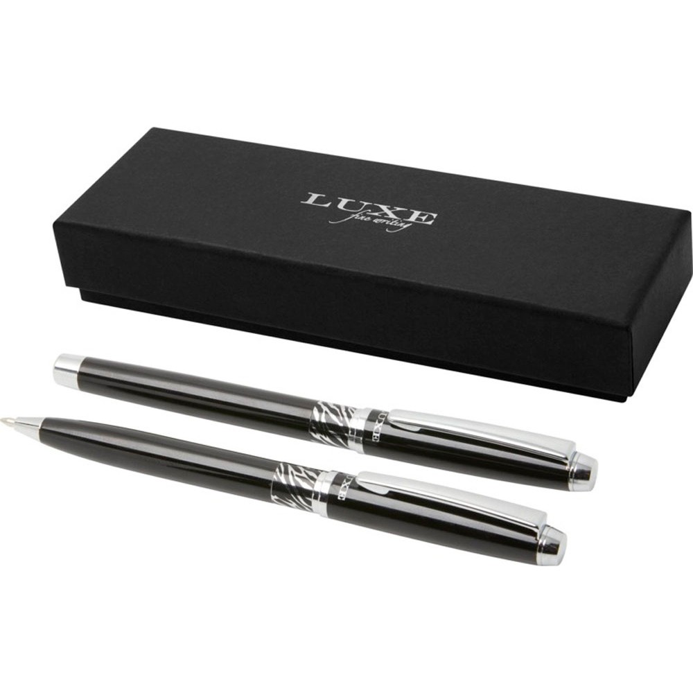 Шариковая ручка и ручка-роллер с декоративным узором на корпусе. Шариковая ручка предварительно заполнена синими чернилами, а ручка-роллер предварительно заполнена черными чернилами. Упакована в подарочную коробку LUXE. Латунь.