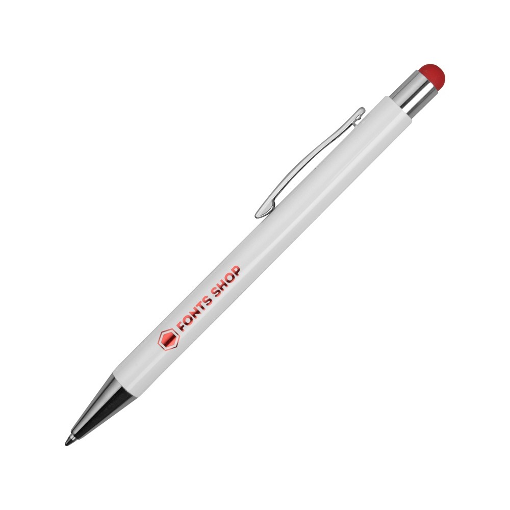Металлическая шариковая ручка-стилус с нажимным механизмом. Под лакированным белым покрытием корпуса скрыт цветной зеркальный слой, раскрываемый в процессе гравировки. Зеркальный слой и стилус выполнены в едином цвете.