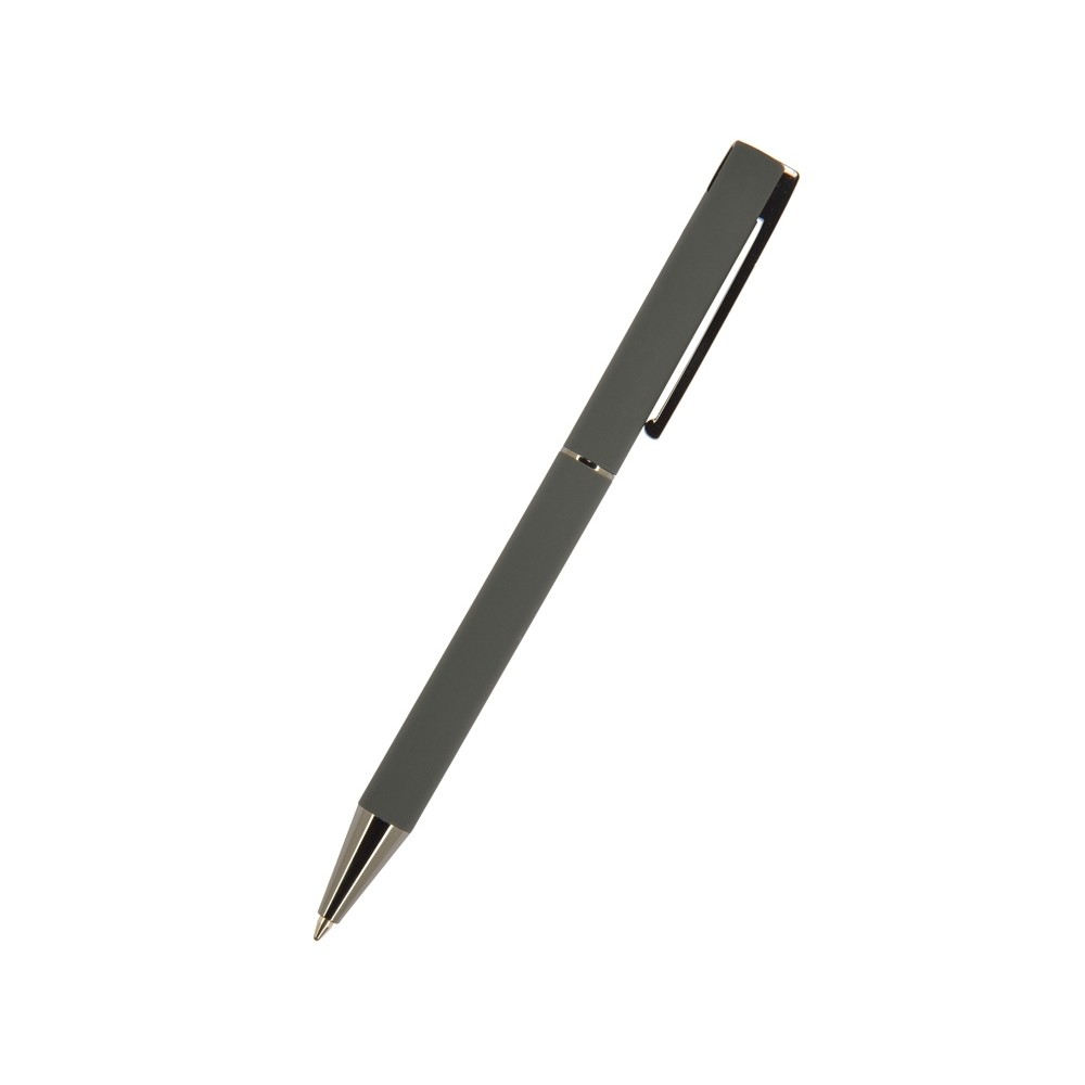 Элегантная ручка в сером корпусе. Автоматическая ручка с поворотным механизмом. Матовое нескользящее покрытие ручки. Толстый кончик стержня обеспечивает легкость письма и аккуратность почерка.