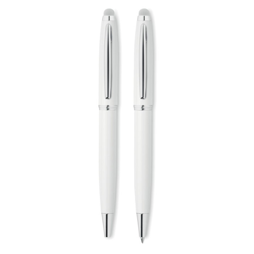 Набор письменный - алюминиевая ручка-стилус (синие чернила) и механический карандаш-стилус в серебряной подарочной коробке.