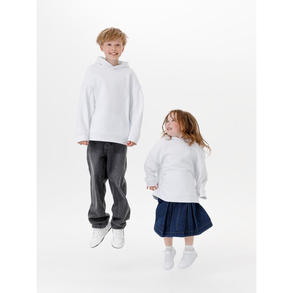 Детское худи оверсайз со спущенным плечом и карманом-кенгуру.