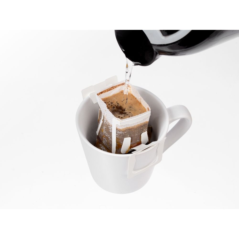 Дрип-пакет — легкий способ альтернативного заваривания натурального кофе прямо в чашке. Вам потребуются только любимая кружка и горячая вода: вскройте фильтр-пакет по линии отрыва, разместите его на чашке и медленно пролейте 150-200 мл воды через молотый кофе. Если хотите получить напиток покрепче — оставьте дрип в кружке на 2-3 минуты.