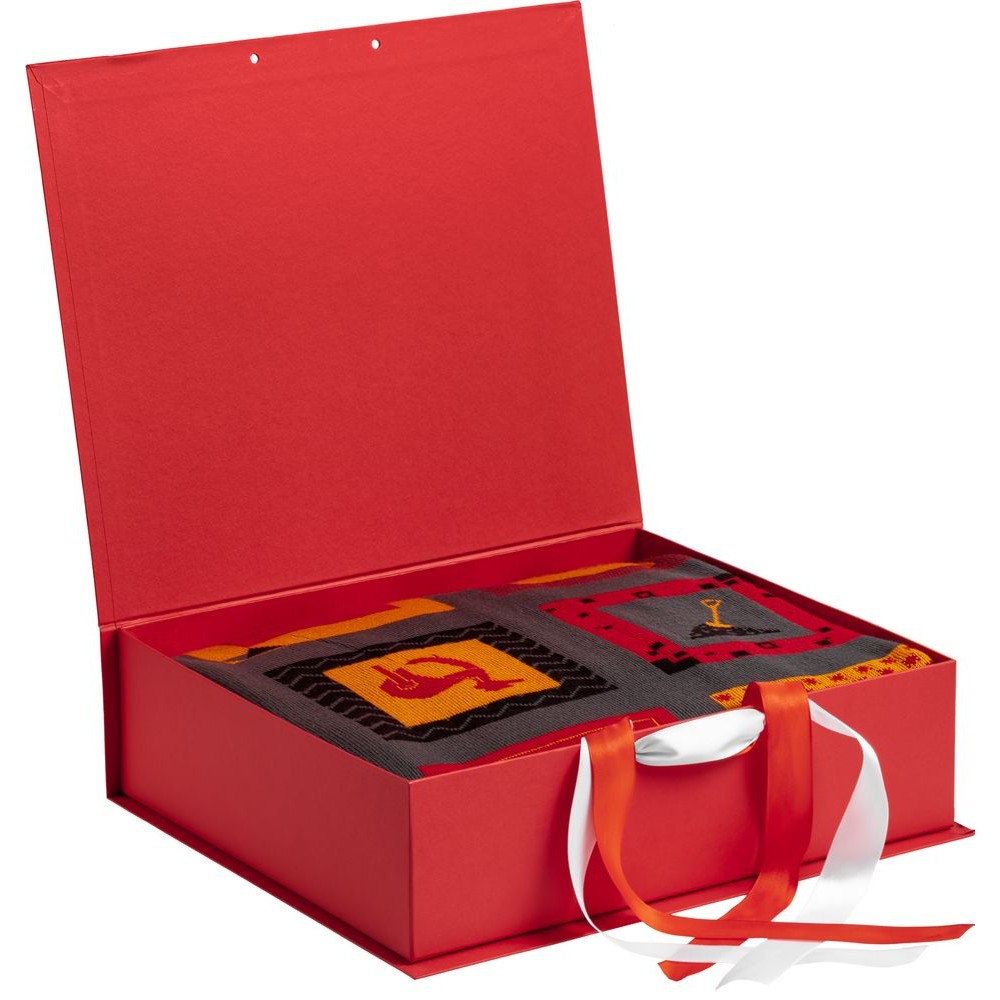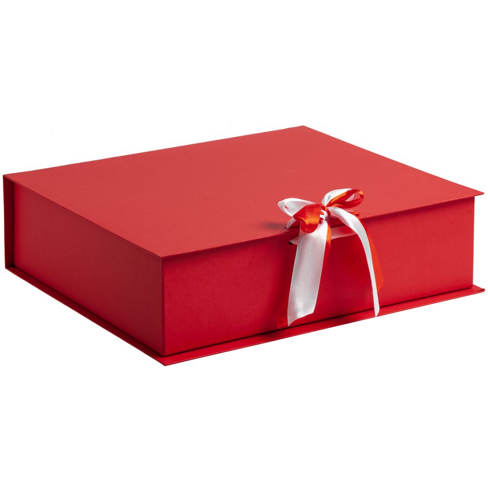 Коробка выполнена из переплетного картона, кашированного дизайнерской бумагой Magic, с крышкой на лентах.
