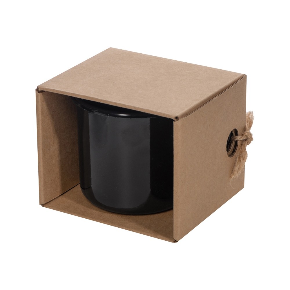 Эмалированная кружка поставляется в необычной упаковке — крафтовой коробке с открытой стенкой. Не беспокойтесь за комплектность — к упаковке кружка присоединена при помощи шпагата, продетого сквозь ручку и отверстия на углу коробки. Необычная подача создает первое впечатление от подарка, заставляя приглядеться к нему внимательнее.