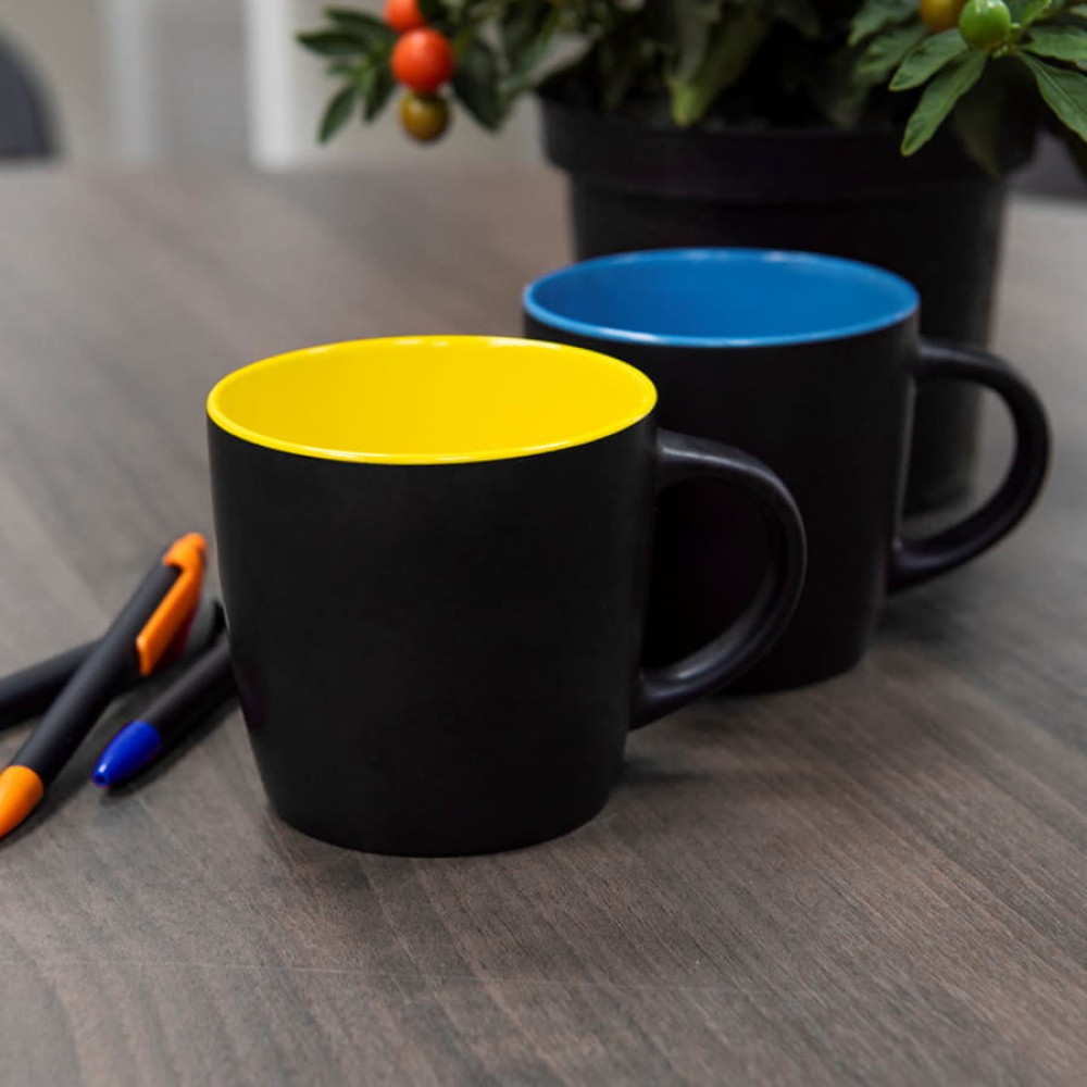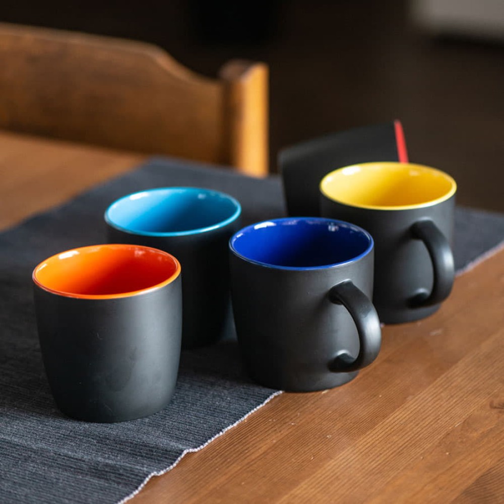 Оригинальная керамическая кружка INTRO объёмом в 350 мл с матовым черным покрытием и яркой цветной внутренней частью будет смотреться эффектно и выразительно на любой поверхности и в любом интерьере.