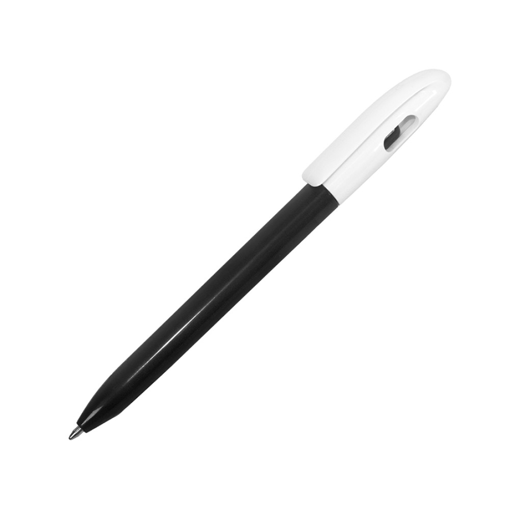 Ручка обтекаемой формы с поворотным механизмом и оригинальной деталью: когда стержень в нерабочем положении, цветная внутренняя кнопка полностью закрывает окошко в верхней части ручки, а когда стержень выдвинут - окошко наполовину открыто.