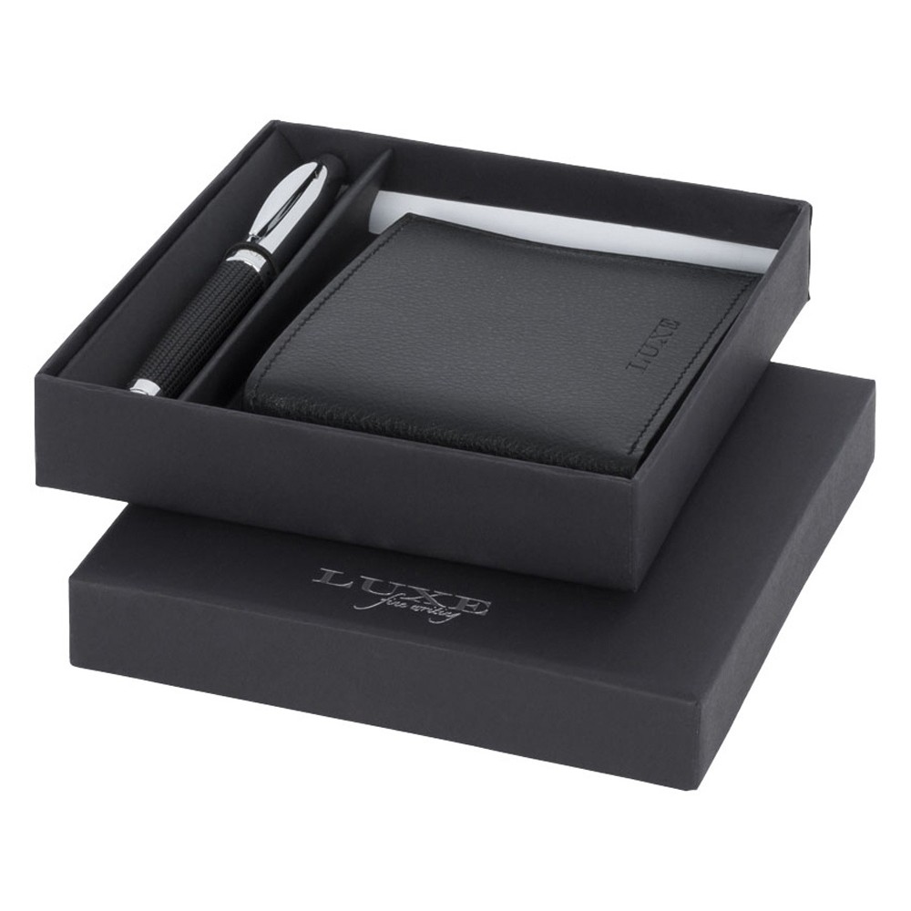 Подарочный набор из шариковой ручки и кошелька. Два необходимых предмета в одном стильном подарочном наборе. Шариковая ручка с кожаным покрытием с бумажником. Эксклюзивный дизайн. Предлагается в подарочной коробке LUXE. Металл и искусственная кожа.