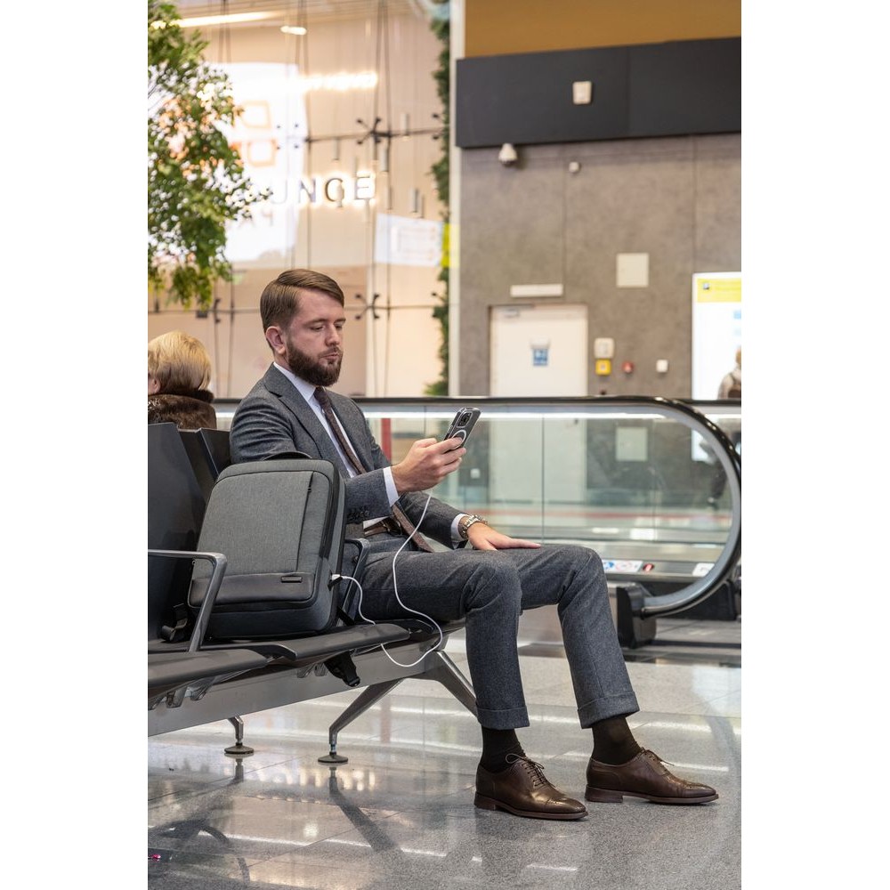 Городской рюкзак для ноутбука Santiago Slim изготовлен из влагозащищенного полиэстера и микрофибры. Карман для бутылок, удобная спинка с мягкими вставками, лямка для крепления к чемодану, эргономичные плечевые ремни и внешний USB-порт делают этот рюкзак незаменимым аксессуаром для работы, поездок и повседневных дел.