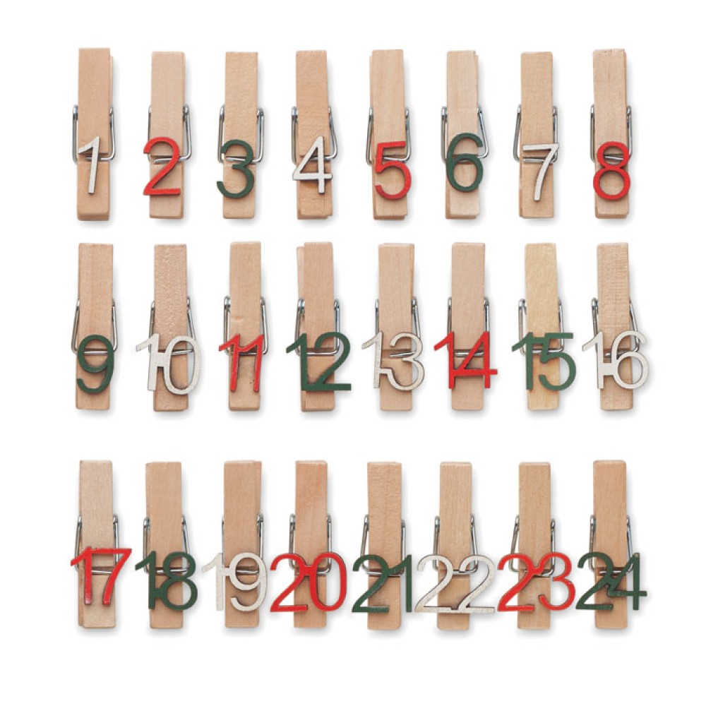 Набор из 24 деревянных зажимов для адвент-календаря. Поставляется в коробке из крафт-бумаги с окошком на лицевой стороне.