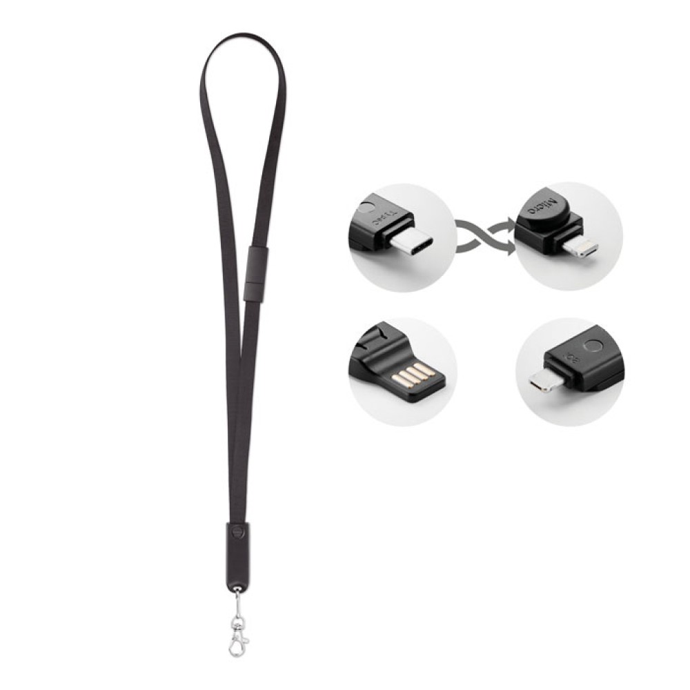 Ланьярд из полиэстера с зарядным кабелем с USB-A на Micro-B (2 в 1 контакт) и типом C. Включает защитный ключ и держатель бейджа.
