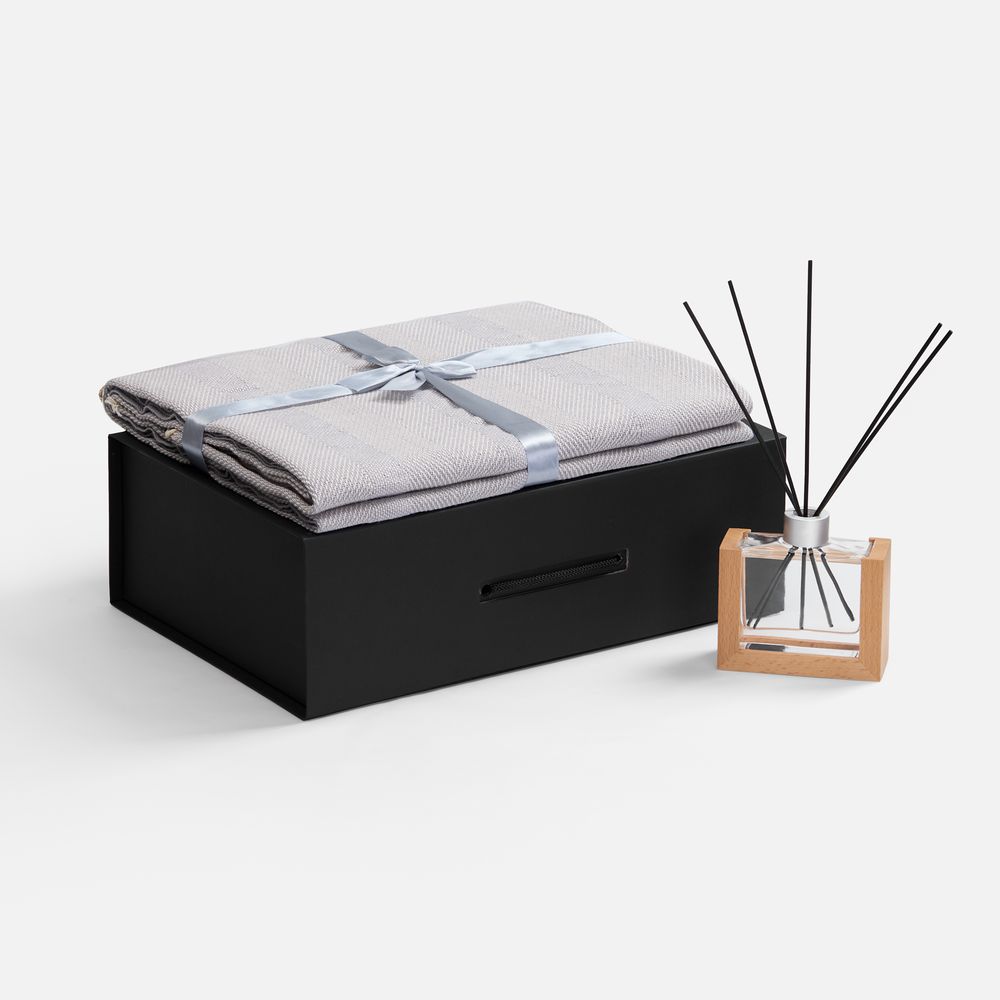 | Размер39х26,3х12,5 см | Цветсерый | Материалфлакон - стекло, палочки из файбера; подставка для флакона - дерево; плед - хлопок 95%, полиэстер 5%, плотность 300 г/м²; коробка - переплетный картон, бумага Malmero |