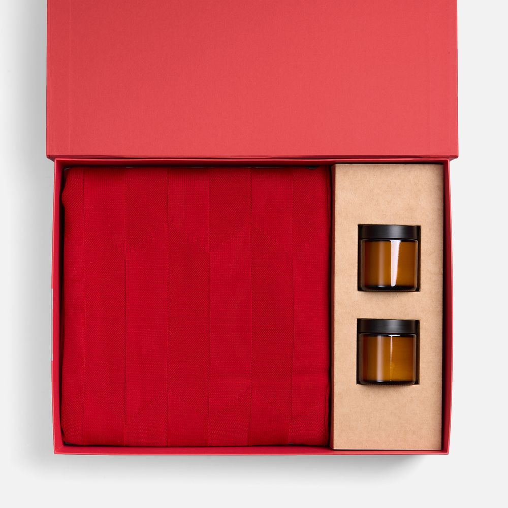 | Материал | плед - акрил 100%, плотность 286 г/м²; подсвечник - стекло, крышка - пластик; свеча - парафин, соевый воск, парфюмерная композиция; коробка - переплетный картон, бумага Сurious |