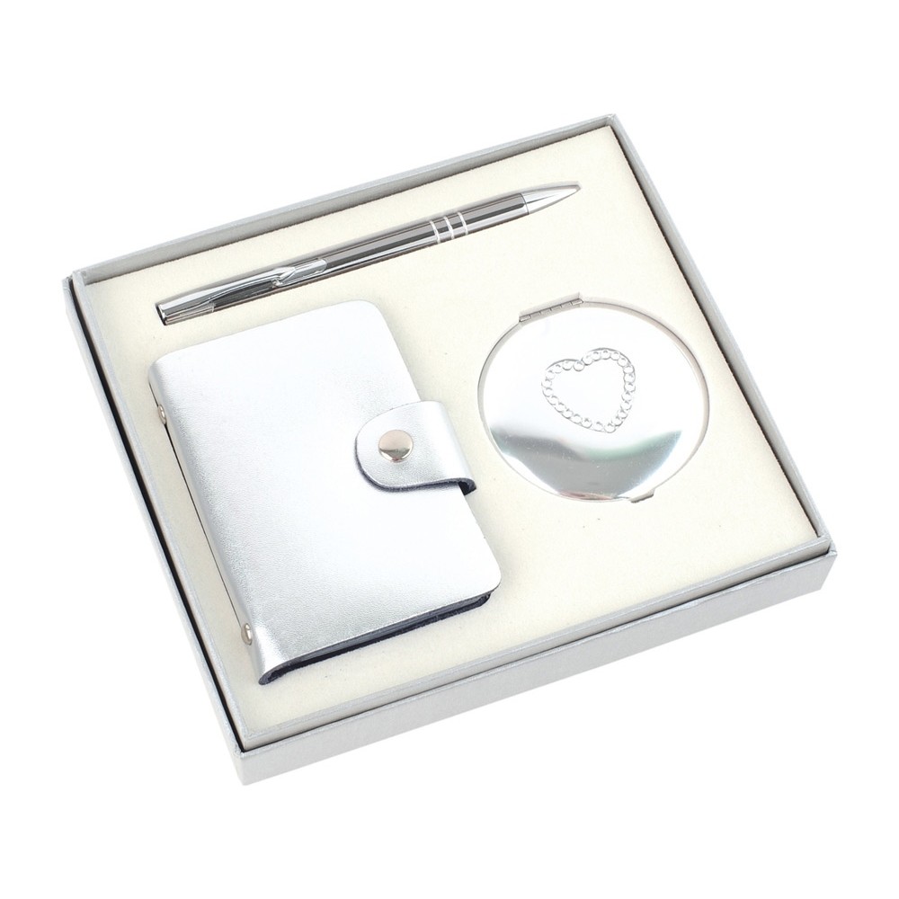 Отличный набор из шариковой ручки, визитницы и зеркала с изображением сердца. Набор выполнен в красивом серебристом или золотистом цвете. Вы можете выгравировать поздравительный текст и сделать набор именным.
