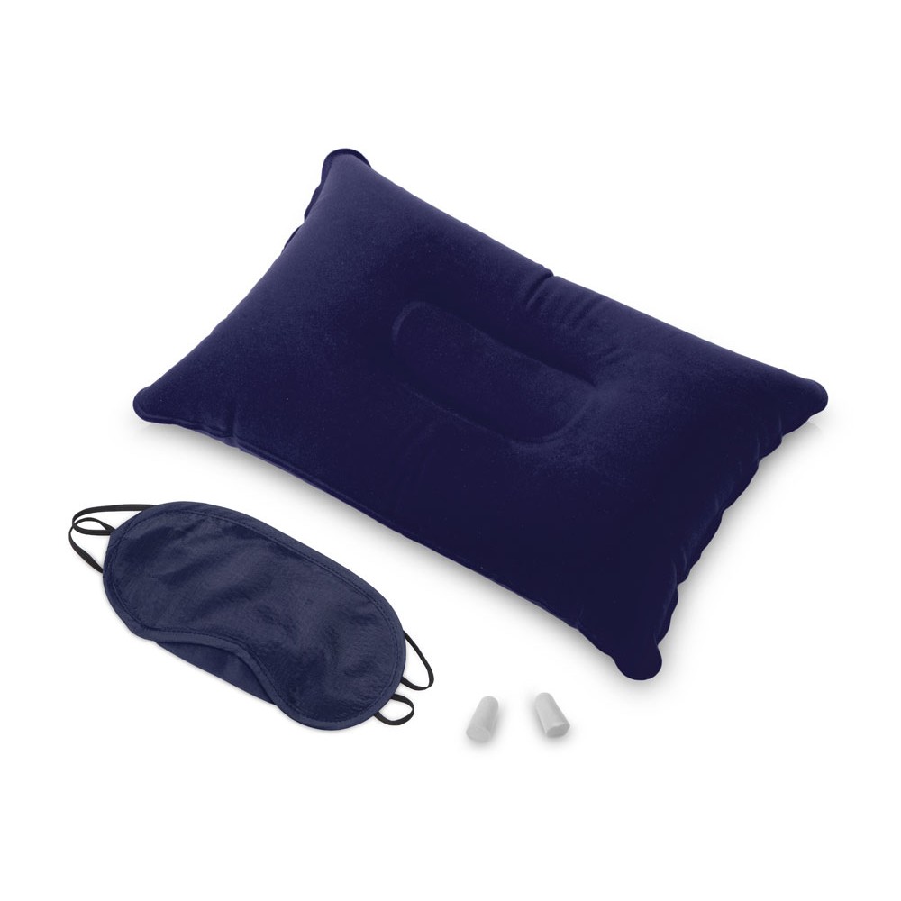 Путешествуйте с комфортом вместе с дорожным набором Cloud, который включает в себя подушку из ПВХ прямоугольной формы, повязку на глаза и полиуретановые беруши.