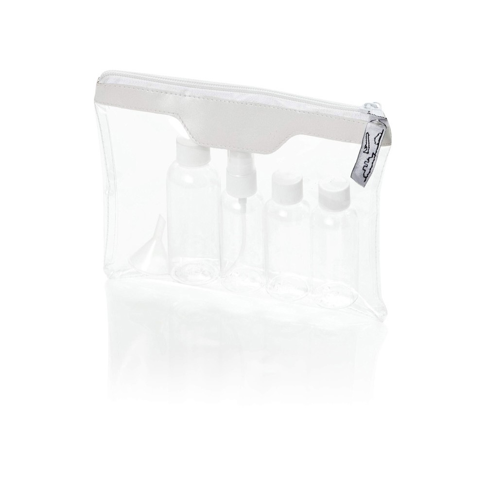 Одобренный дорожный набор бутылок для полетов Munich. Сумка для туалетных принадлежностей, которую можно брать в самолет. Включает 2 бутылки по 50 мл, 1 бутылку на 90 мл, 1 пульверизатор и воронку. Бутылки, пульверизатор и воронка упакованы в полиэтиленовый кулек отдельно от чехла. ПВХ.