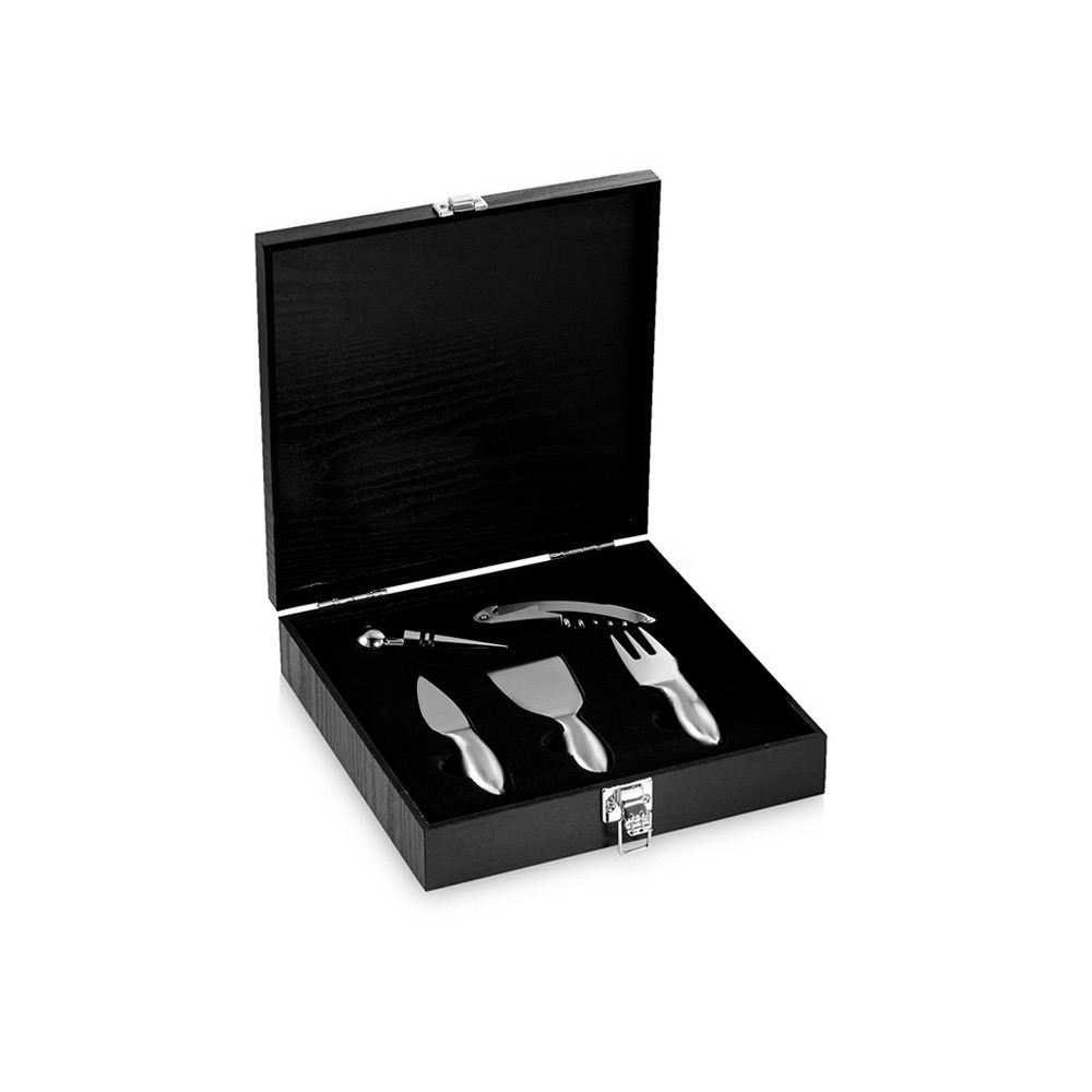Набор для сыра и вина Mino. В этот набор из 5-ти предметов входит три ножа для мягкого сыра, твердого и зрелого сыра, стоппер для вина и штопор. Набор предлагается в деревянной подарочной коробке с шильдом 40 х 25 мм для лого.