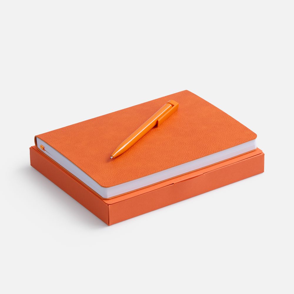 Недатированный ежедневник с гибкой обложкой из фактурного материала La Fite и металлическим шильдом на ляссе и ручка в тон, упакованные в подарочную коробку из дизайнерского картона.