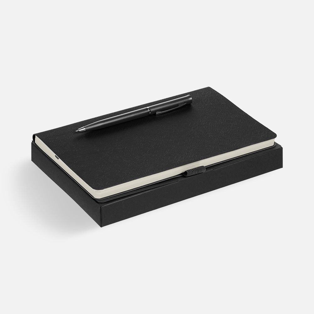 Зауженный ежедневник и ручка комплементарного оттенка в простой лаконичной коробке — готовое предложение делового подарка для сотрудников и партнеров.