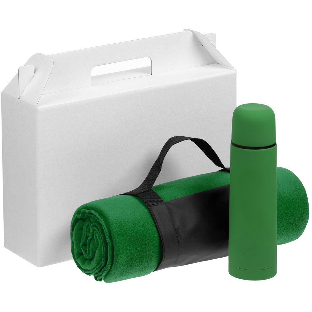 | Материал | плед - флис, плотность 180 г/м²; термос - нержавеющая сталь, 304 внутри, 201 снаружи, пластик, покрытие софт-тач; коробка - микрогофрокартон |