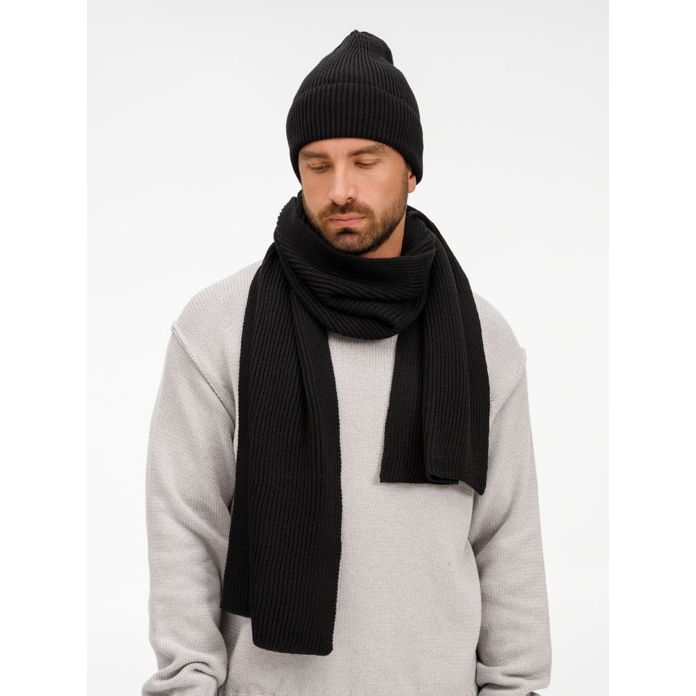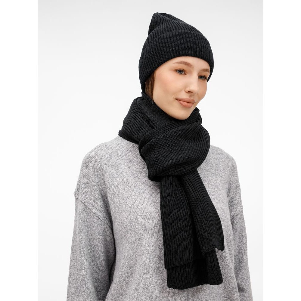 Удлиненная шапка с широким отворотом и фактурной вязкой мягко облегает голову, создавая элегантный силуэт. Широкий шарф с выразительным рельефом позволяет экспериментировать с драпировками, добавляя образу объем и динамику. Перчатки с аккуратной резинкой на манжете обеспечивают идеальную посадку и тактильный комфорт.