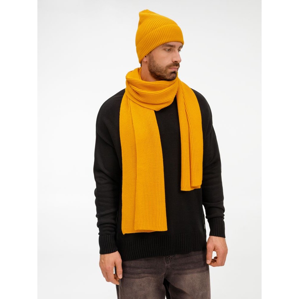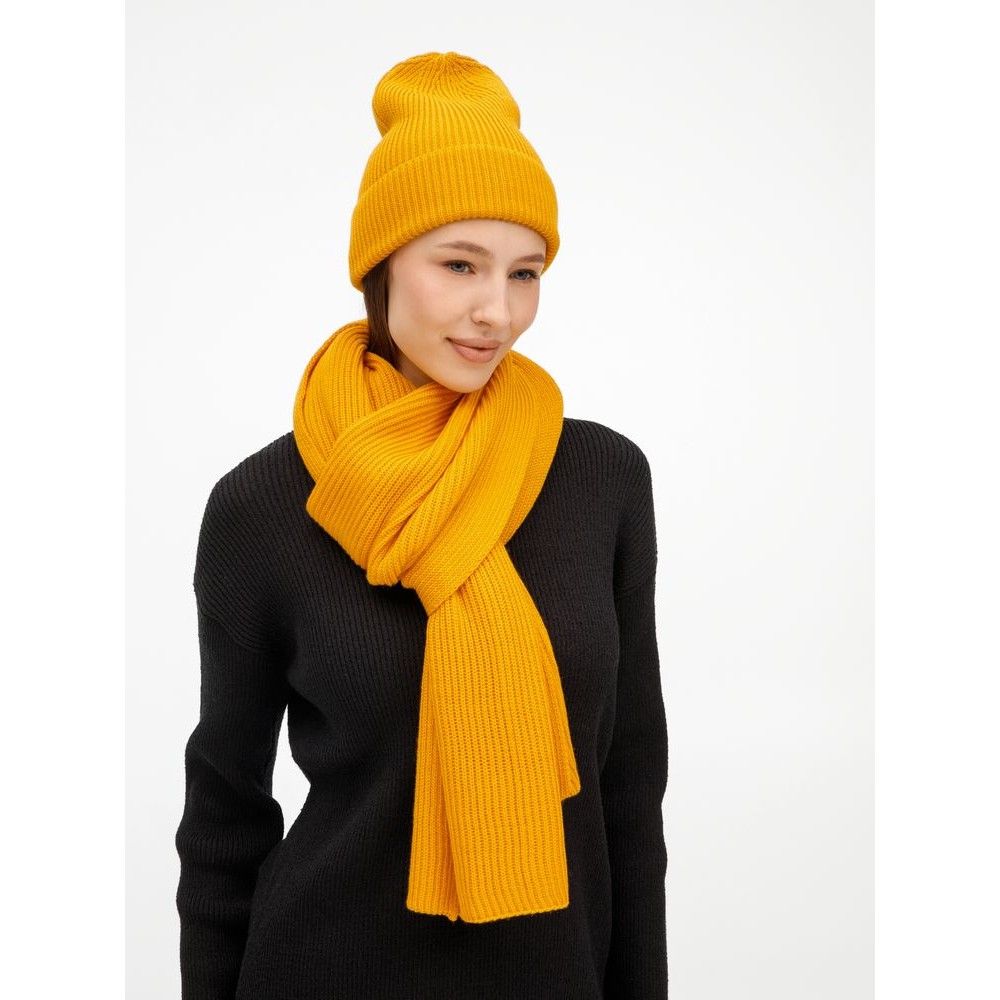 Удлиненная шапка с широким отворотом и фактурной вязкой мягко облегает голову, создавая элегантный силуэт. Широкий шарф с выразительным рельефом позволяет экспериментировать с драпировками, добавляя образу объем и динамику. Перчатки с аккуратной резинкой на манжете обеспечивают идеальную посадку и тактильный комфорт.