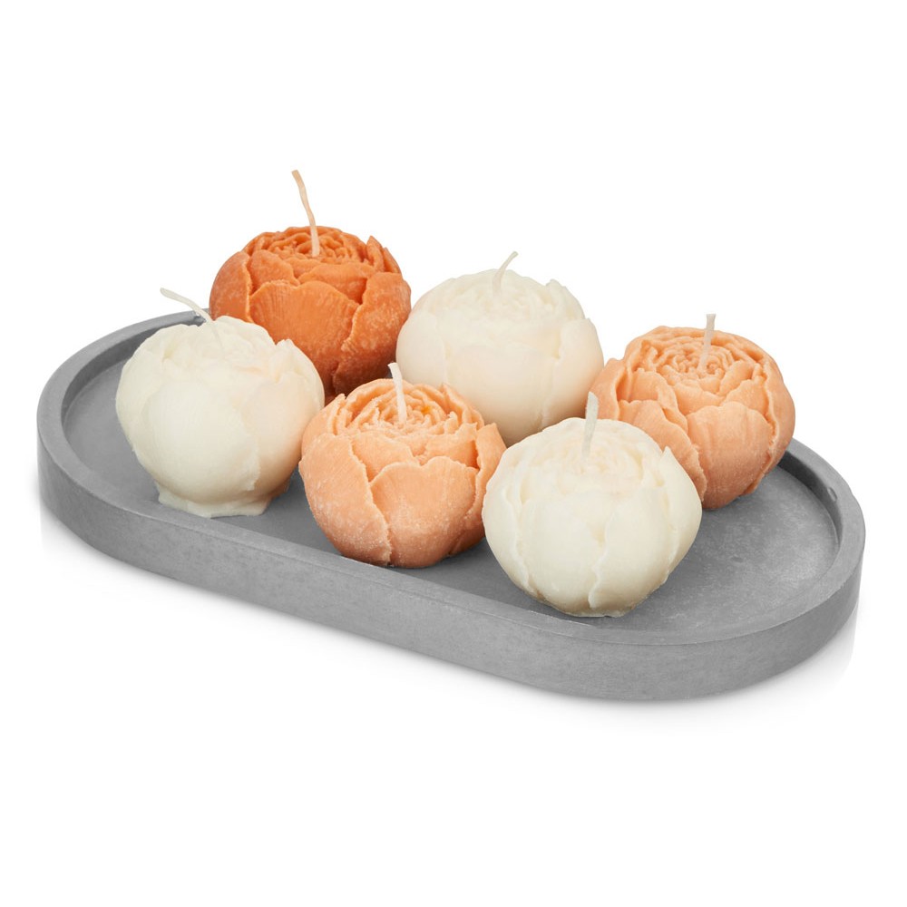 | Комплектность | три белых свечи пион, одна темно-персиковая свеча пион, две персиковые свечи пион, подставка гипсобетон, упаковочный материал |