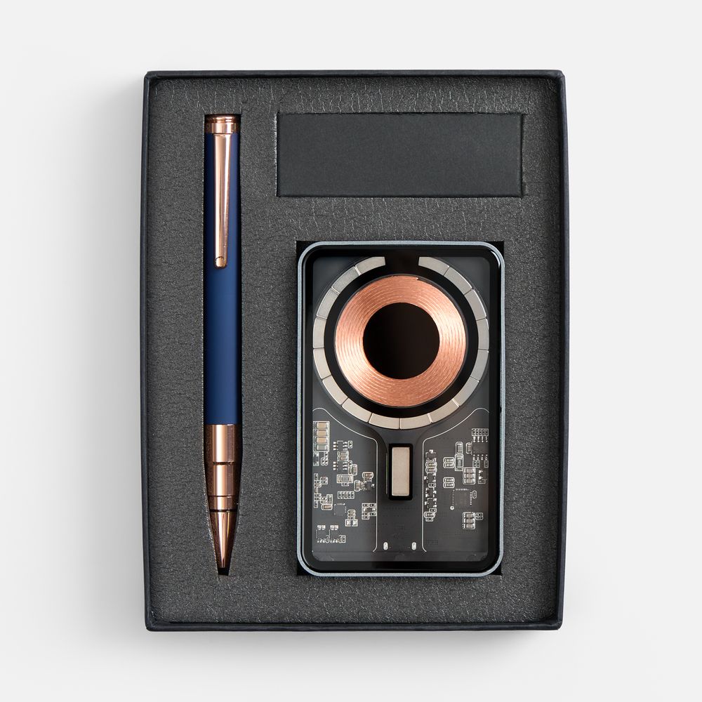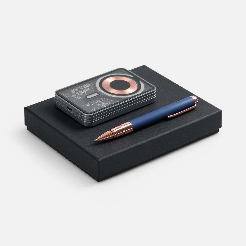 Необычный беспроводной аккумулятор Cooper Ergo и увесистая ручка Kugel Rosegold составляют вместе идеальный дуэт — с легким оттенком стильного стимпанка и намеком на прогрессивность. Набор станет идеальным подарком как для коллег, так и для руководителей, и покорит получателей оригинальностью и новизной исполнения.