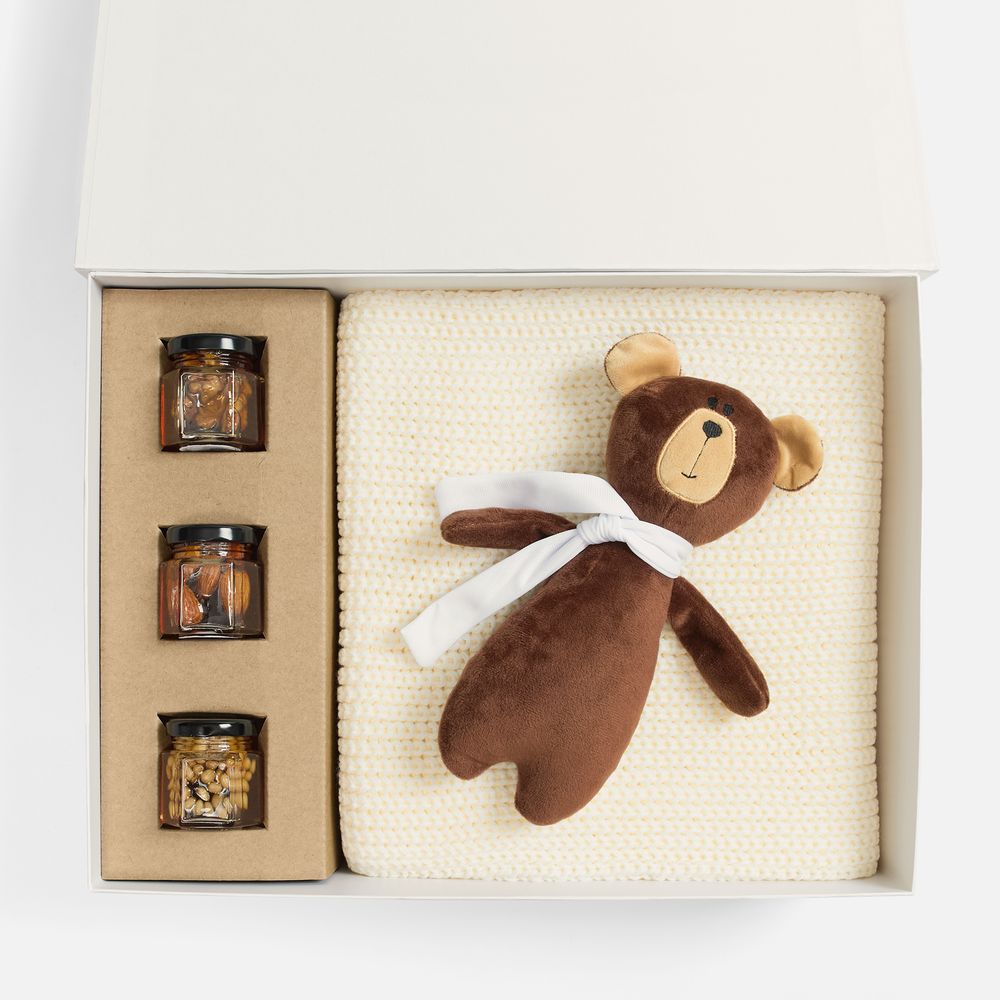 | Размер41х30х10 см | Цветбелый | Материалшарф - акрил 100%; игрушка - велюр; набивка, шарфик - полиэстер 100%; баночки для меда - стекло; коробка - переплетный картон, бумага Majestic |