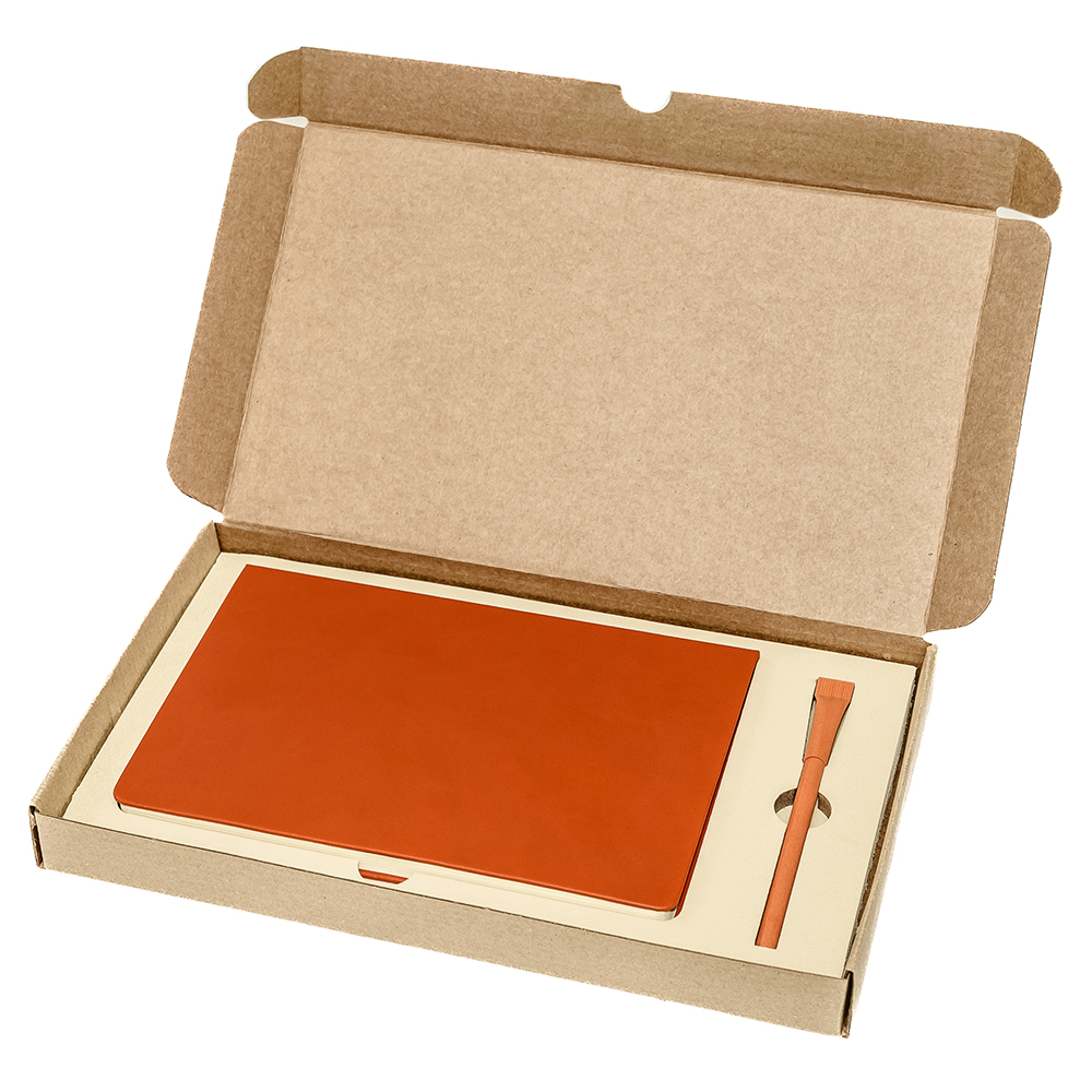 Подарочный набор в стильной картонной коробке бежевого цвета. Внутри на аккуратном ложементе располагаются ежедневник недатированный в твердом переплете и картонная ручка с колпачком.