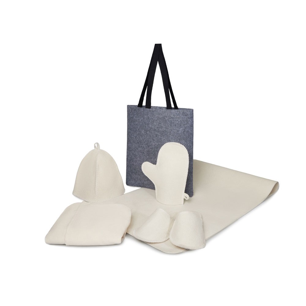 Женский банный набор Healing для комфортного отдыха: лежак для бани, холщовый килт-парео, рукавица, шапка и тапочки — всё аккуратно упаковано в стильный фетровый шоппер.