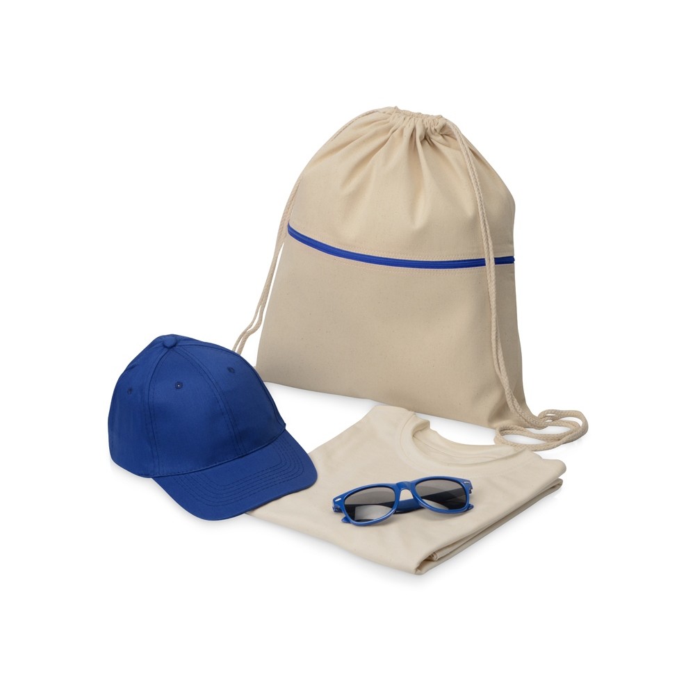 Набор для прогулок и активного отдыха. Набор состоит: - Рюкзак-мешок Lark хлопковый с цветной молнией; - Очки солнцезащитные Sun ray; - Бейсболка Detroit; - Футболка Pure из неокрашенного хлопка, мужская.