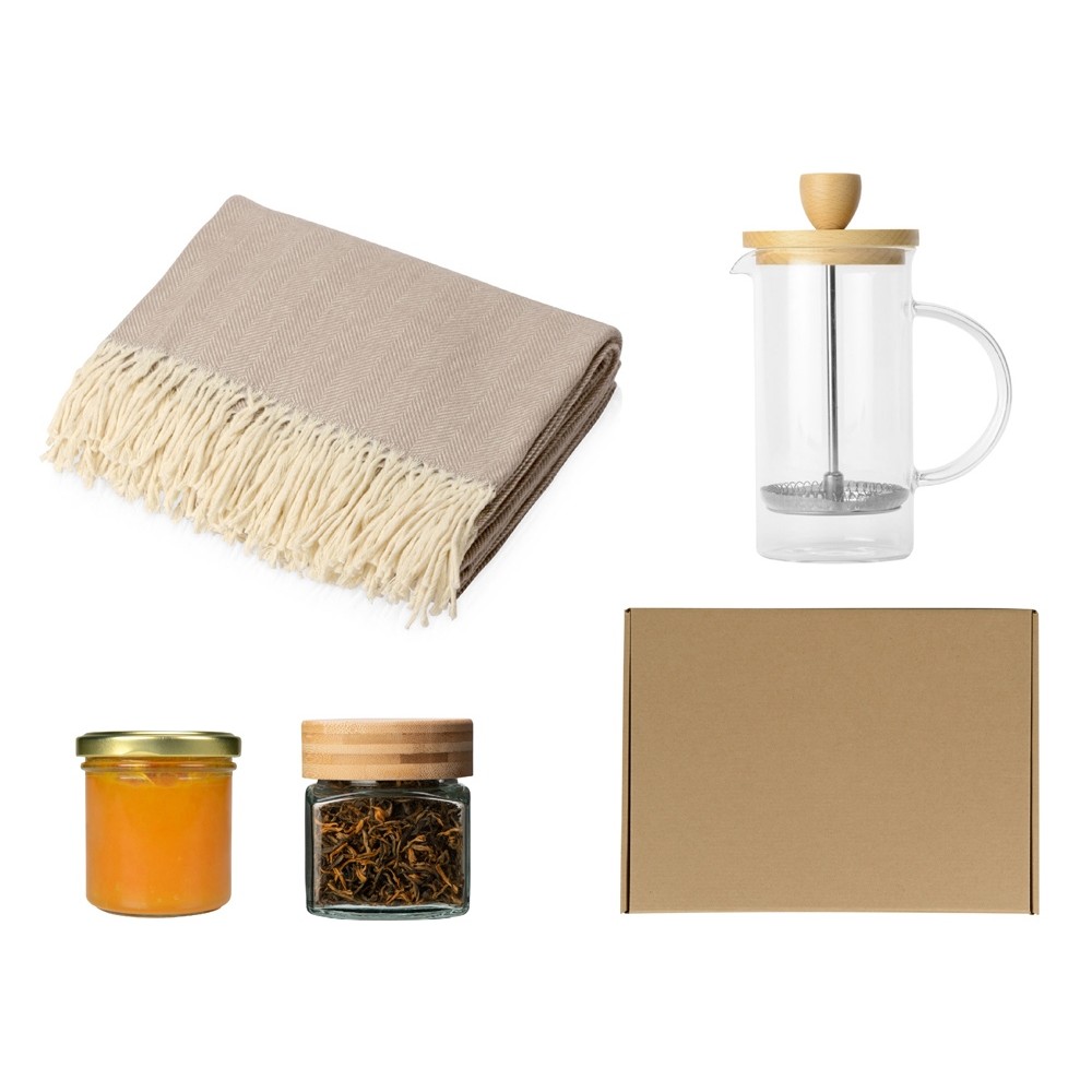 • Подарочный набор с пледом, френчпрессом, чаем и вареньем, бежевый