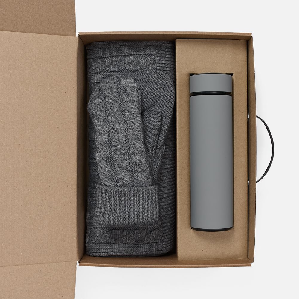 Размер26,3x36,6x10 см Цветсерый Материалшарф, варежки - акрил 100%; термос - нержавеющая сталь, 304; покрытие софт-тач; коробка - микрогофрокартон