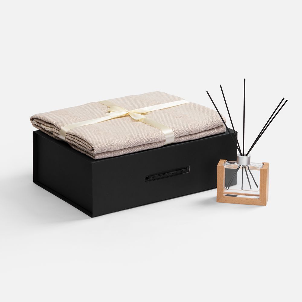 Размер39х26,3х12,5 см Цветбежевый Материалфлакон - стекло, палочки из файбера; подставка для флакона - дерево; плед - хлопок 95%, полиэстер 5%, плотность 300 г/м²; коробка - переплетный картон, бумага Malmero