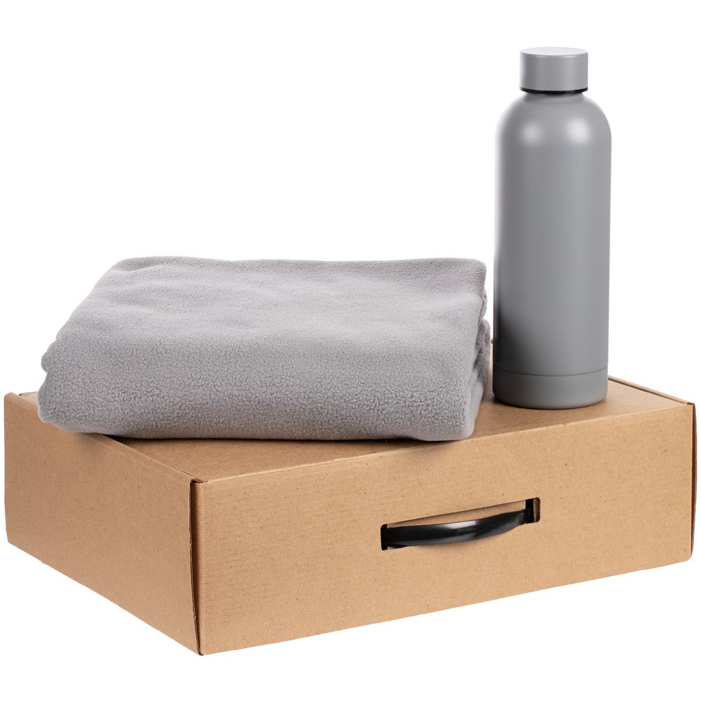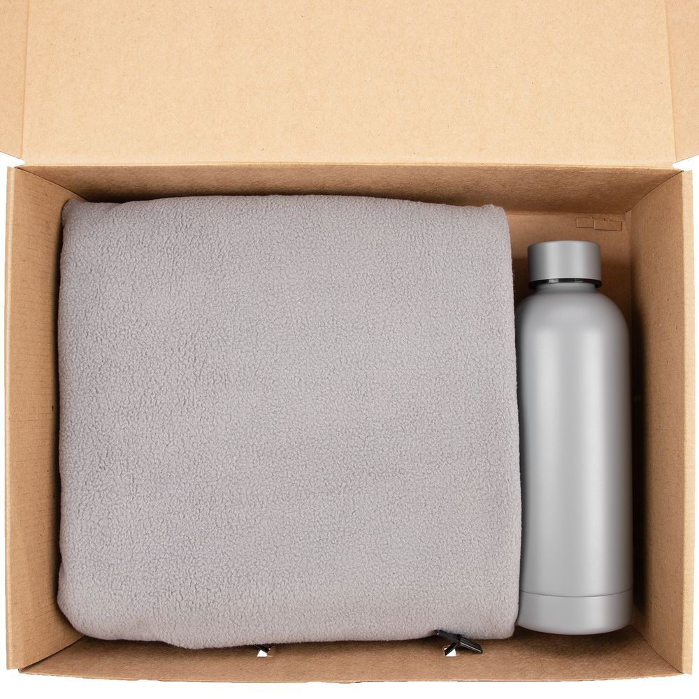 | Размер26,3x36,6x10 см | Цветсерый | Материалбутылка - металл, пластик; плед - флис; коробка - микрогофрокартон, пластик |