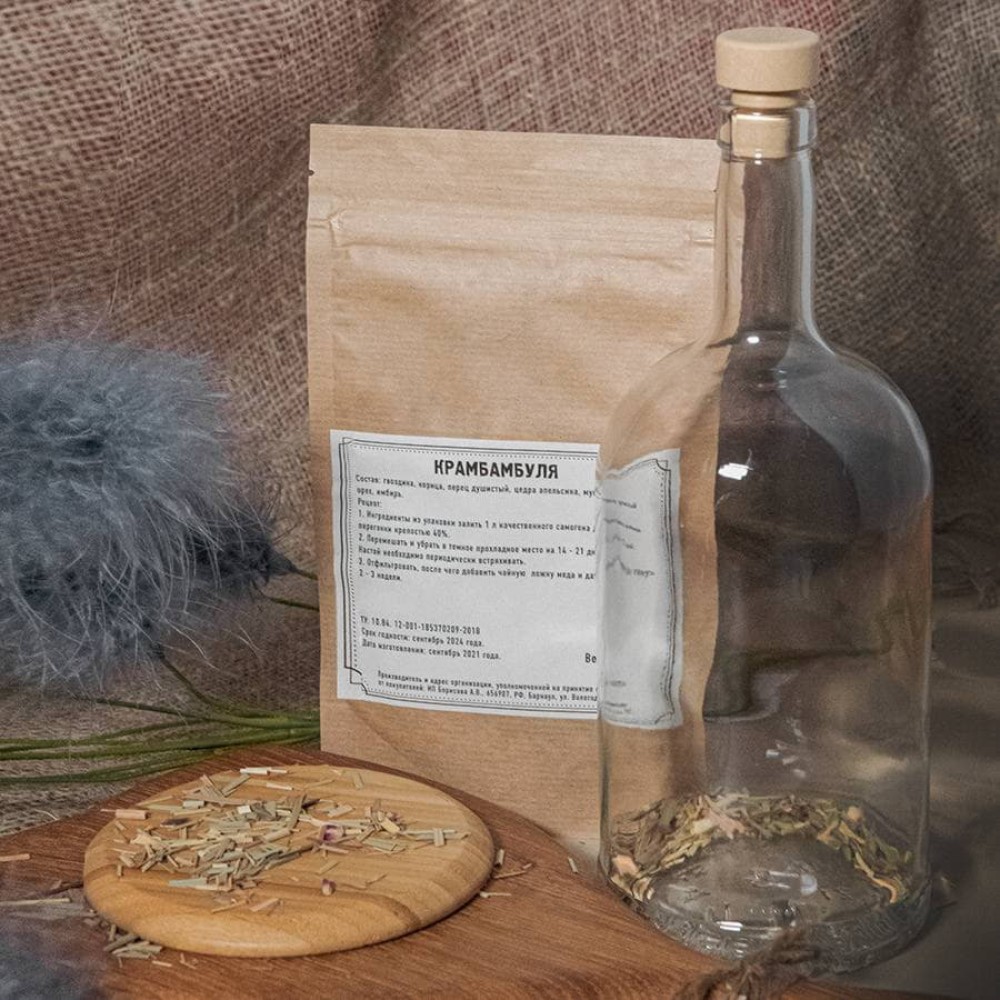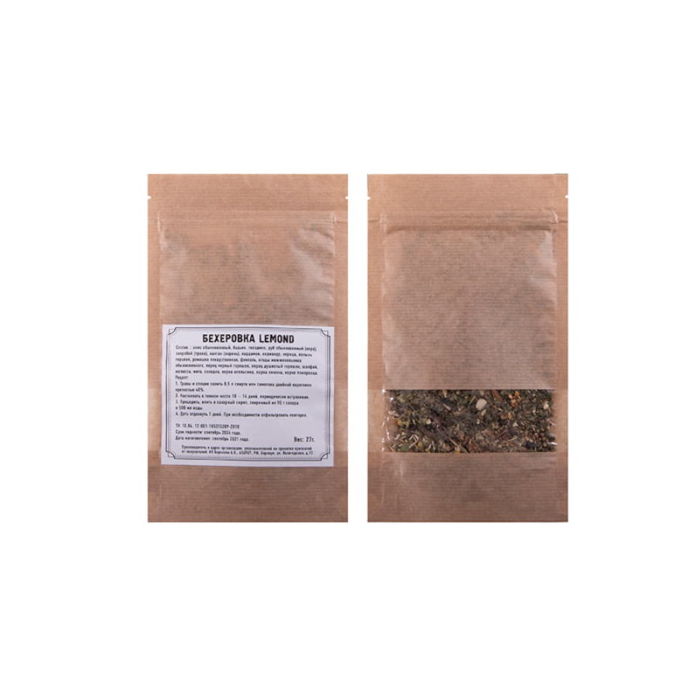 - набор трав и специй "Бехеровка Lemond" (анис обыкновенный, бадьян, гвоздика, дуб обыкновенный (кора), зверобой (трава), калган (корень), кардамон, кориандр, корица, полынь горькая, ромашка лекарственная, фенхель, ягоды можжевельника обыкновенного, перец черный горошек, перец душистый горошек, шалфей, мелисса, мята, солодка, корка апельсина, корка лимона, корка померанца).