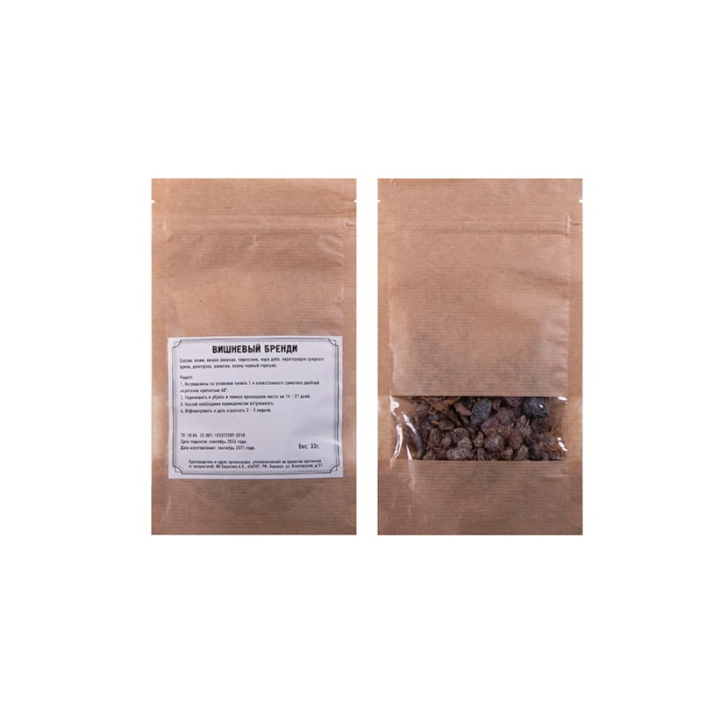 - набор трав и специй "Вишневый бренди" (изюм, вишня вяленая, чернослив, кора дуба, перегородки грецкого ореха, декстроза, ванилин, перец черный горошек),