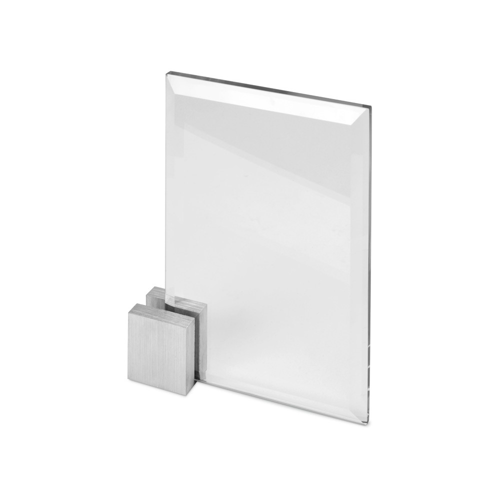Минималистичная стеклянная награда с небольшим угловым постаментом из стали (не съемный). Внушительная площадь для нанесения обеспечивается простотой формы и маленьким размером постамента.